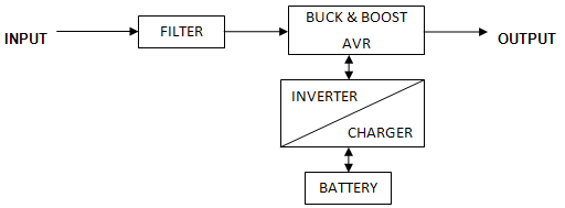 همان طور که در بلوک دیاگرام شکل زیر دیده میشود این طراحی از جهاتی مشابه سیستم standby است با این تفاوت که در شرایط عملکرد عادی نیز اینورتر توان خروجی را تامین می نماید . در این طراحی ابتدا توان AC ورودی توسط رکتیفایر به DC و سپس توسط اینورتر،DC به AC تبدیل می گردد و امکان عملکرد دو سویه وجود ندارد .
