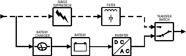اینورتر تنها هنگامی شروع به کار میکند که منبع ورودی دچار خرابی گردد .در این تکنولوژی توان خروجی از کیفیت چندان مناسبی برخوردار نبوده و از نظر ولتاژ و فرکانس به ورودی وابسته می باشد (مگر در مواردی که توسط استابلایزر و یا ترانس های فرو رزونانس ، اصلاح ولتاژ انجام شود).